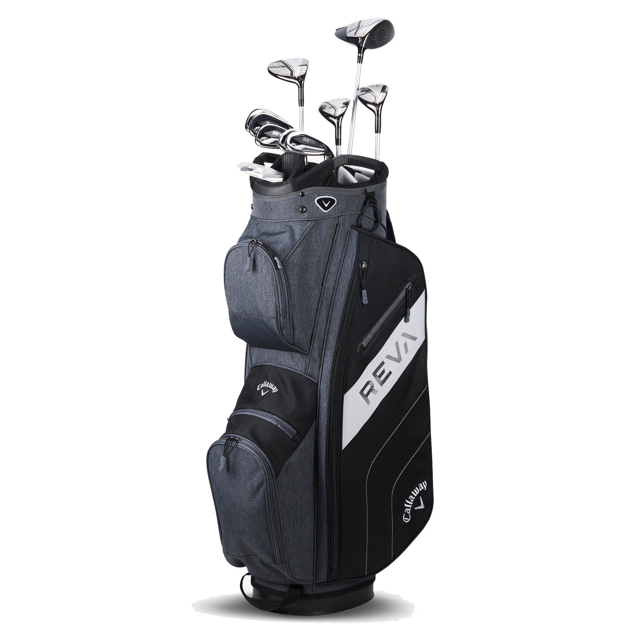 Dieses 11-teilige REVA-Set enthält einen Driver mit Callaways Verbundkronentechnologie, 3-Holz, 5- und 6-Hybride, Eisen 7 bis 9, Pitching- und Sand-Wedge, Putter, Cart Bag und (5) Premium-Schlägerhauben.